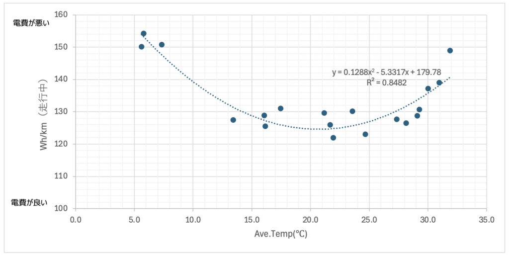 下図は、電費と外気温の関係を示した散布図です。グラフの下に行くほど電費が良いのですが、概ね20℃をピークです。低温時が最も電費が落ちるのですが、高温時も電費が落ちる事を示しています。今回の比較でいうと10月はまだ30℃を超える日もあったため、11月より電費が悪かったのだと思います。