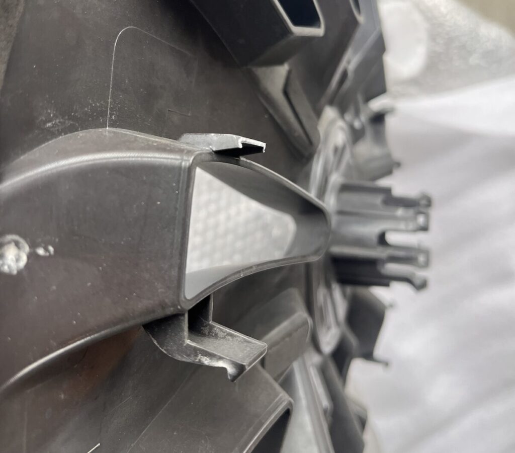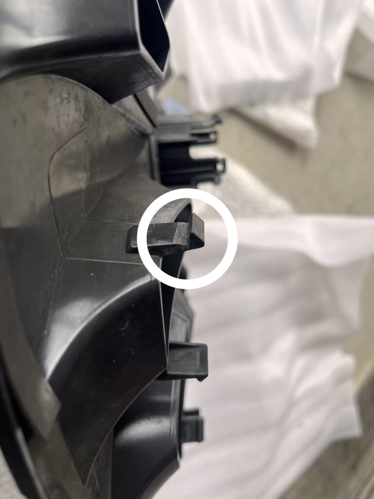 写真の白丸部がホイールへ引っ掛ける部分です。少しグレーになっている所が摩耗している部位です。この摩耗で締めしろが小さくなり、カバーがガタついたという事だと推測しています。